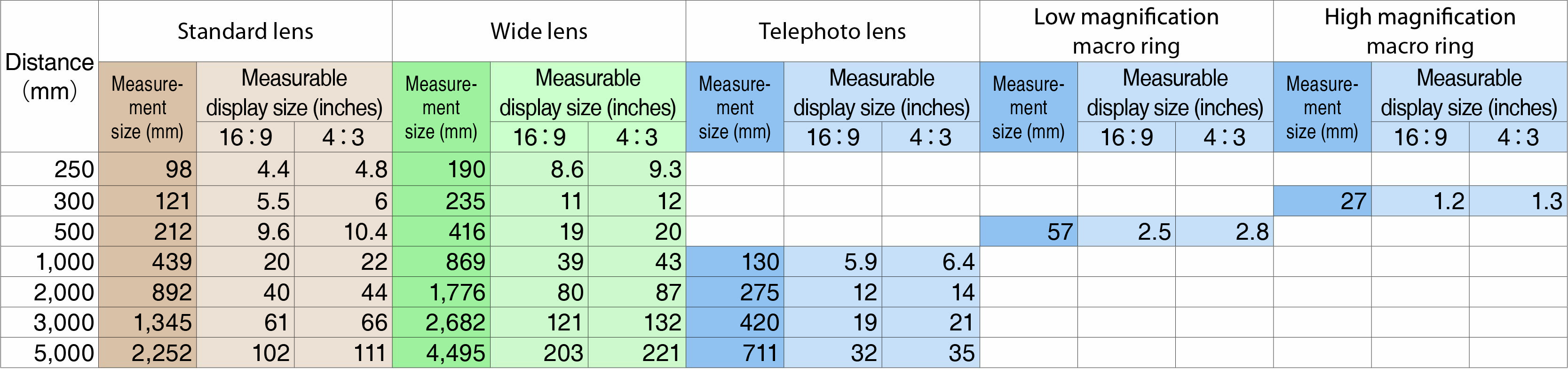 Standard, wide, tele(macro ring 부속) 3종류 렌즈가 포함됨. 타깃이나 측정방법의 차이에 따라 최적의 렌즈를 선택할 수 있습니다.